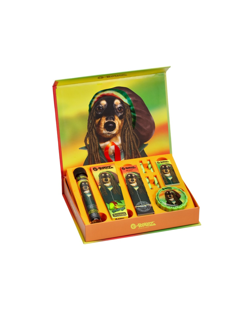 Kit Do Bob Marley traz consigo , um grinder, um caderno de filtros, 4 filtros de carvão ativo, Mortalhas, Pre-Enrolados Com sabor a Manga , e traz consigo Autocolantes